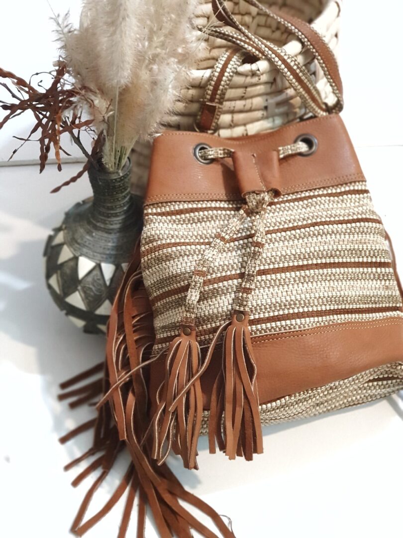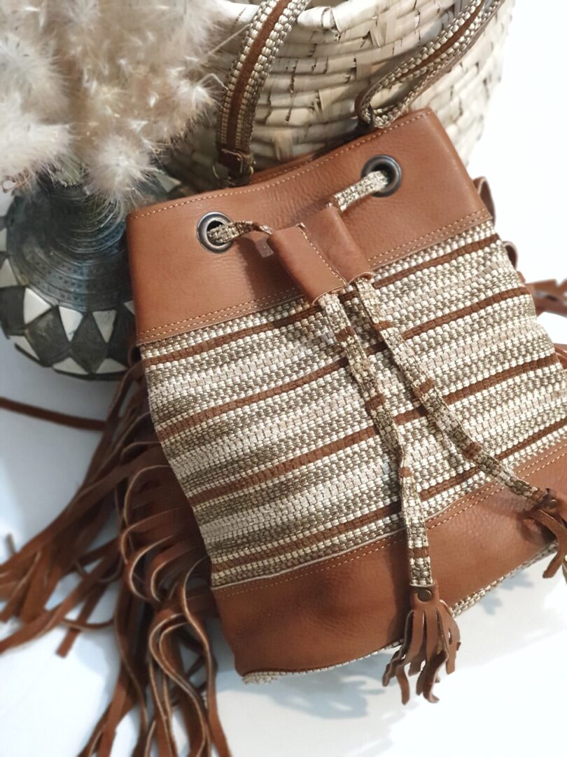 Leather bag combined with a sackcloth fabric with fringes on the sides. A long strap that allows for bag-length play.