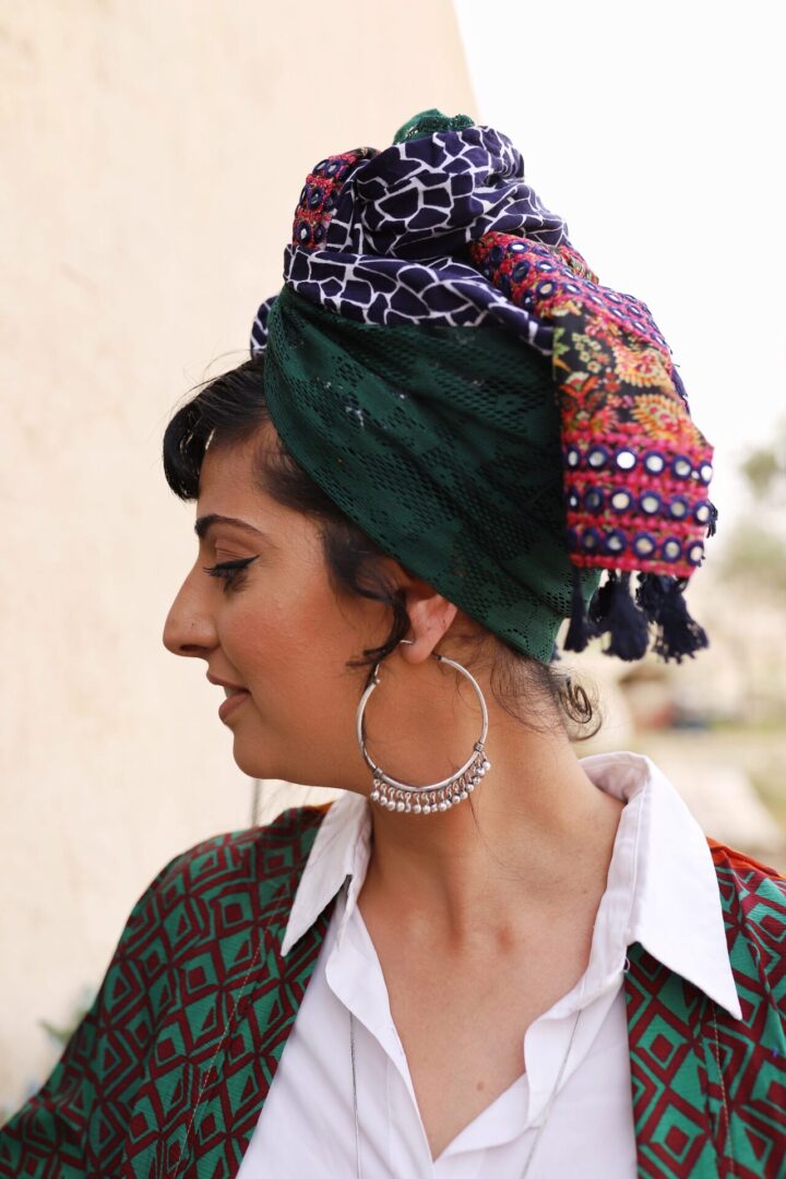 The scarf combines 3 special types of fabrics that create a super interesting look with games of animal print in shades of blue and white combined with green lace fabric and spectacular mirror embroidery embroidered on printed fabric.