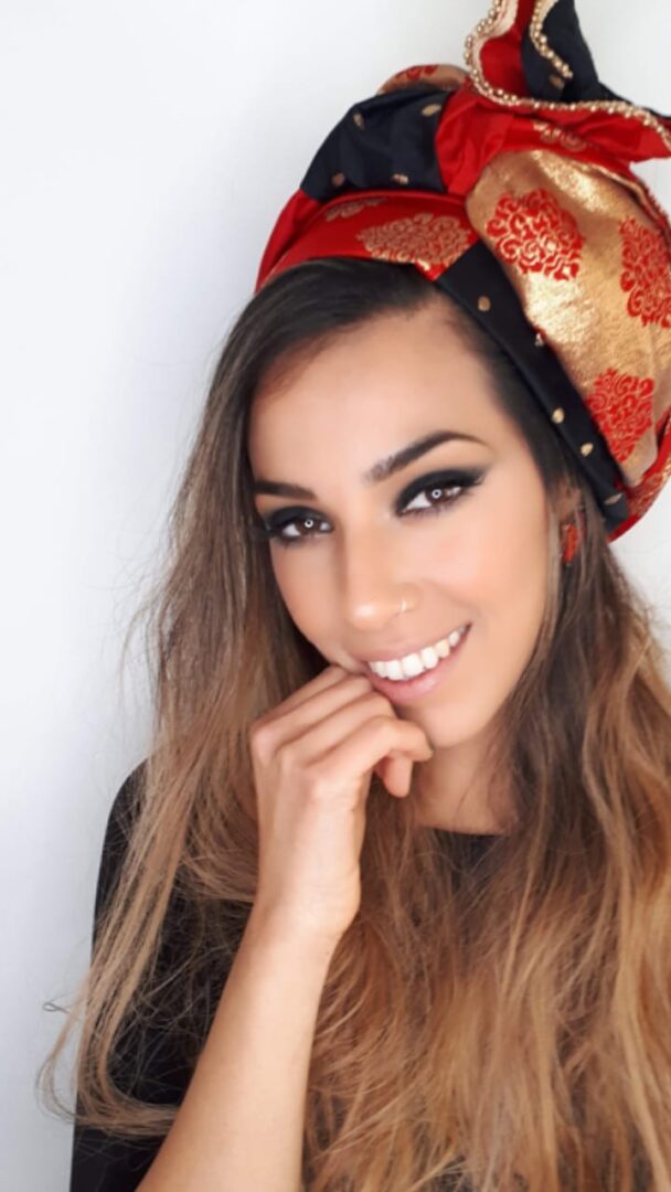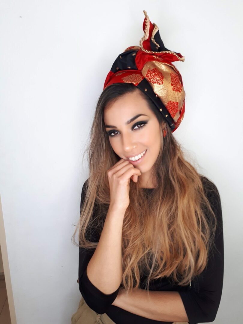 Scarf combined 3 fabrics with delicate embellishments and a gold bead extension. Length 2 meters by 50