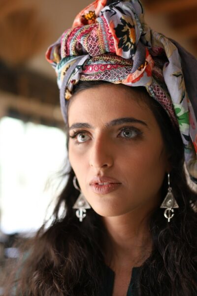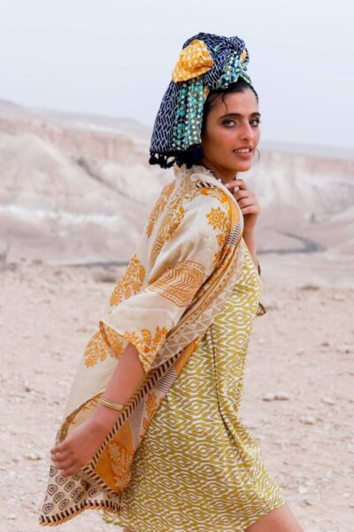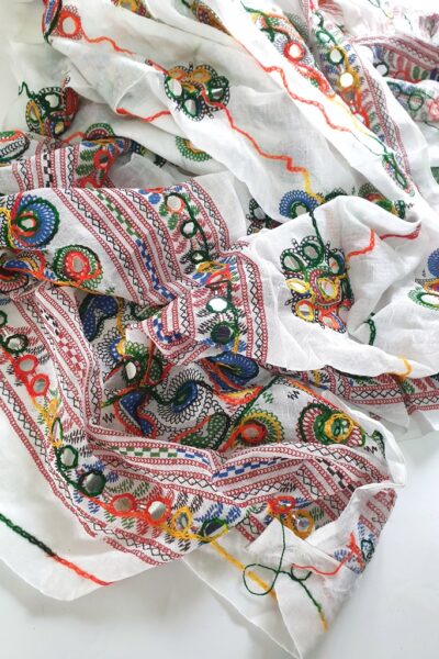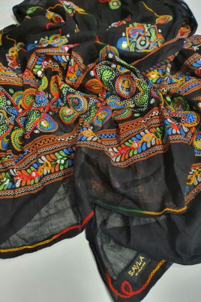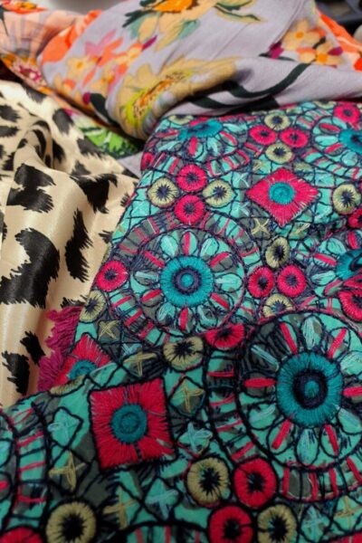 Colorful Tai Dai style print, animal print in earth tones, and black fabric with a floral pattern with delicate sequins