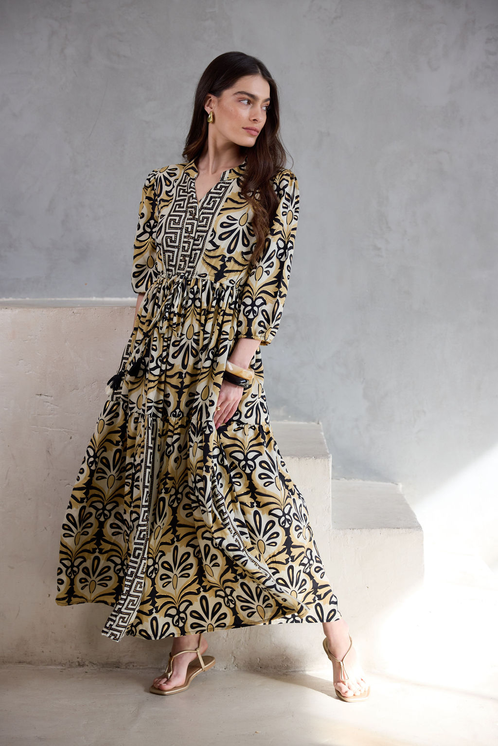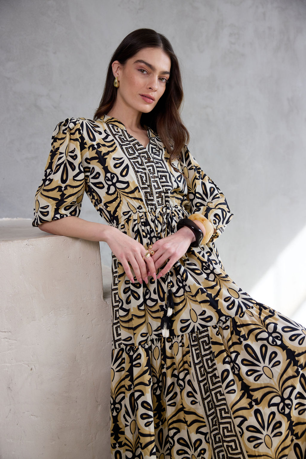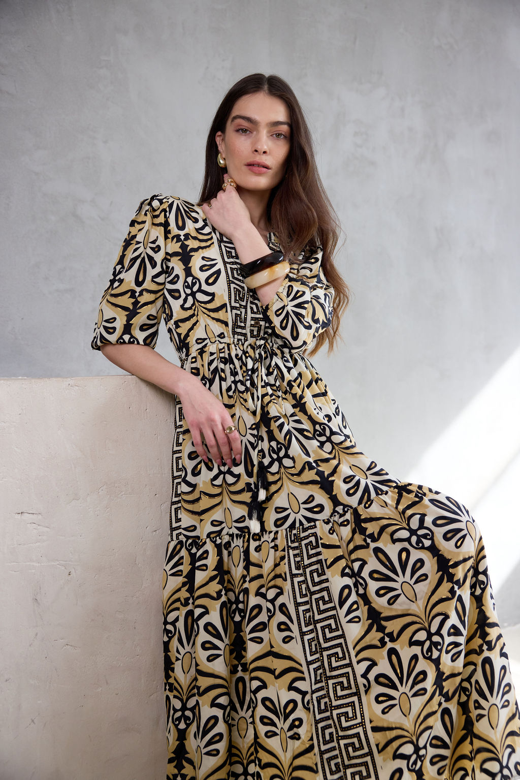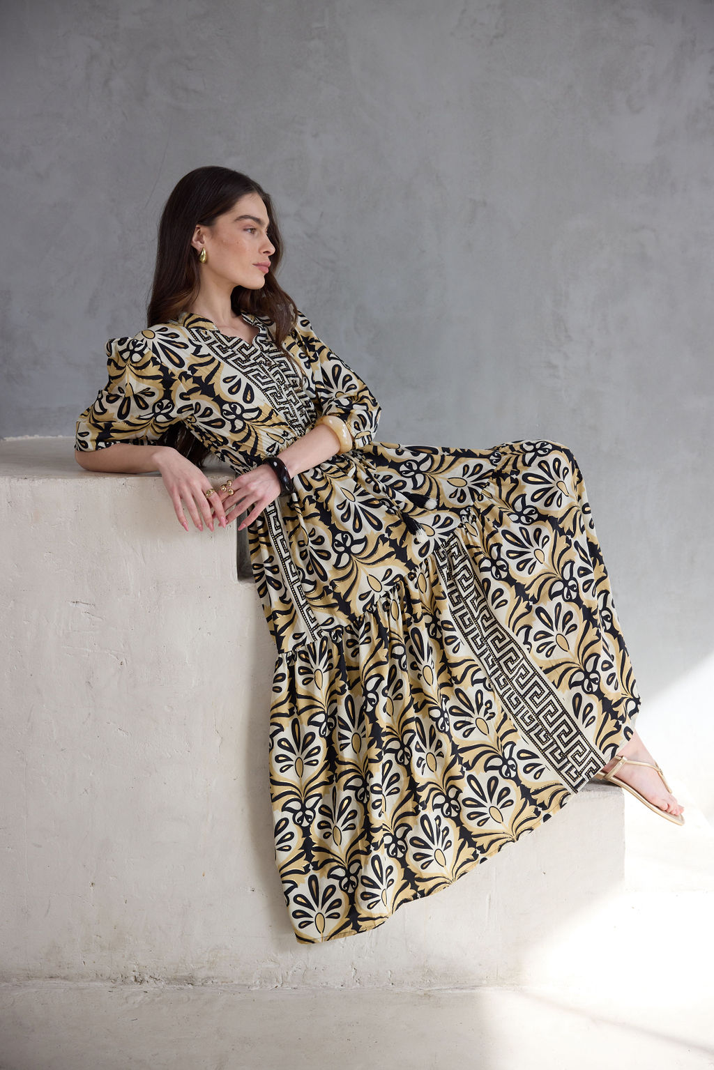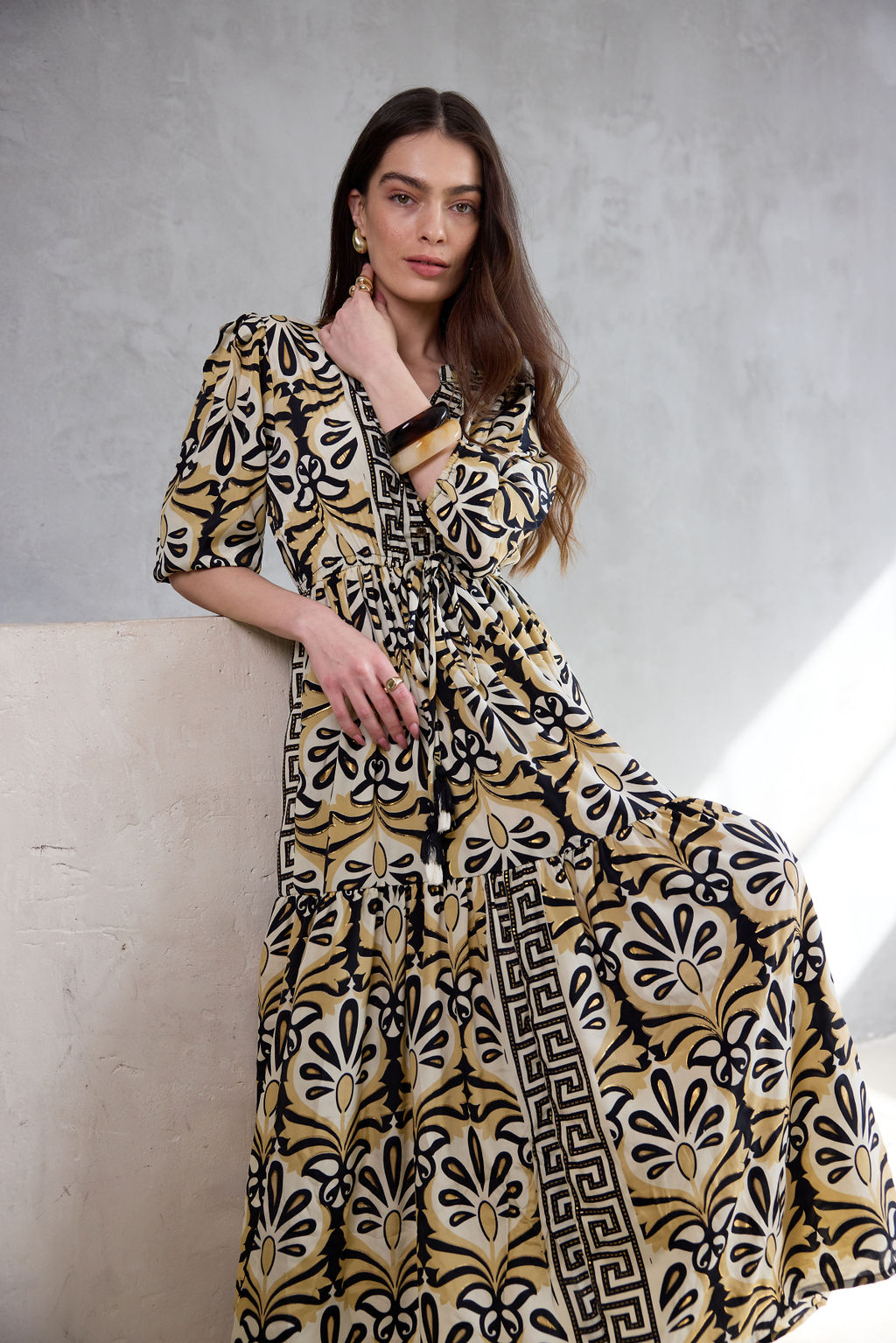 שמלה נשפכת בעיצוב בוהו שיק, עם הדפס ייחודי המעוטר בנגיעות זהב שנוספות למראה האלגנטי.