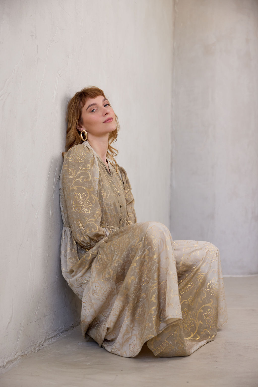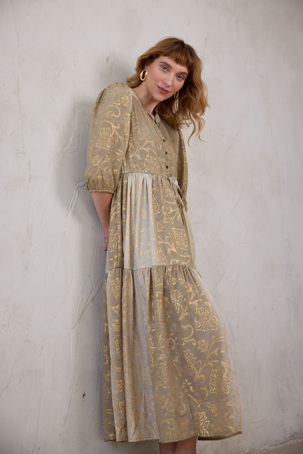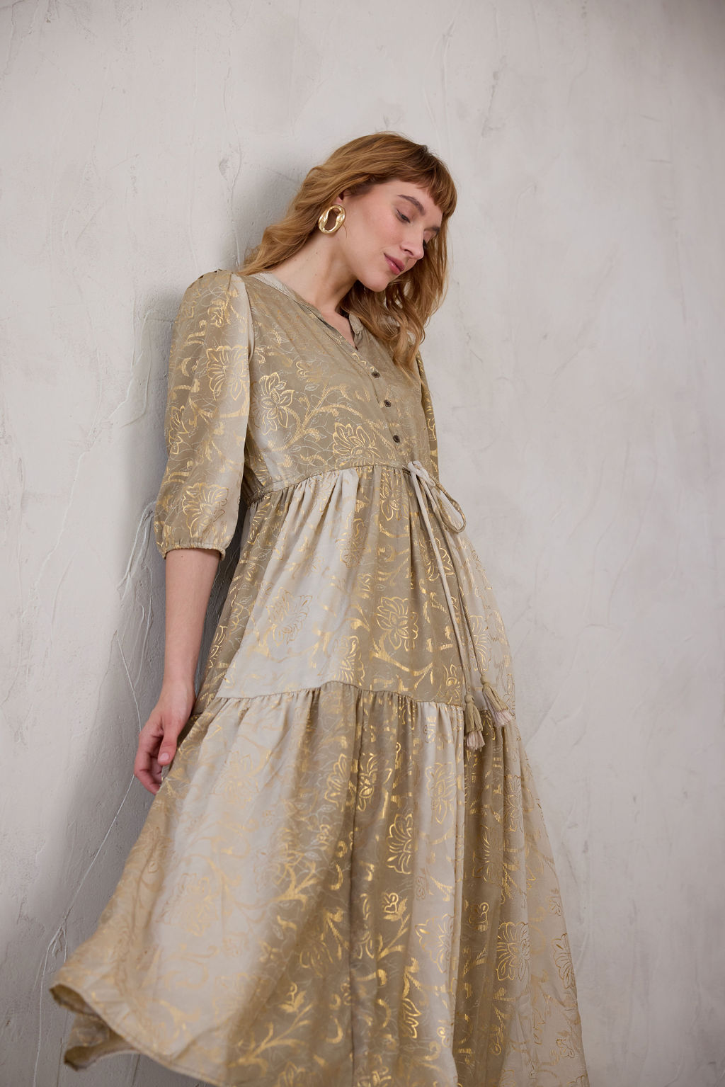 שמלה נשפכת בעיצוב בוהו שיק, עם הדפס ייחודי המעוטר בנגיעות זהב שנוספות למראה האלגנטי.