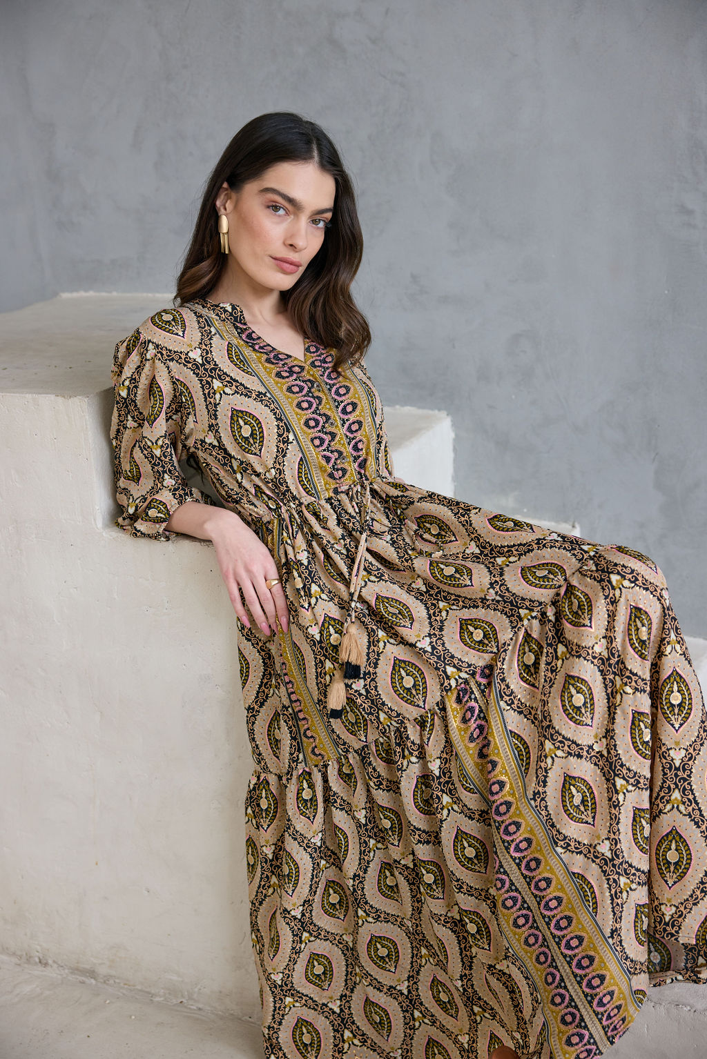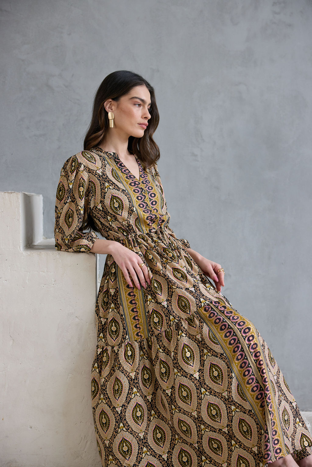 שמלה נשפכת בעיצוב בוהו שיק, עם הדפס ייחודי המעוטר בנגיעות זהב שנוספות למראה האלגנטי.
