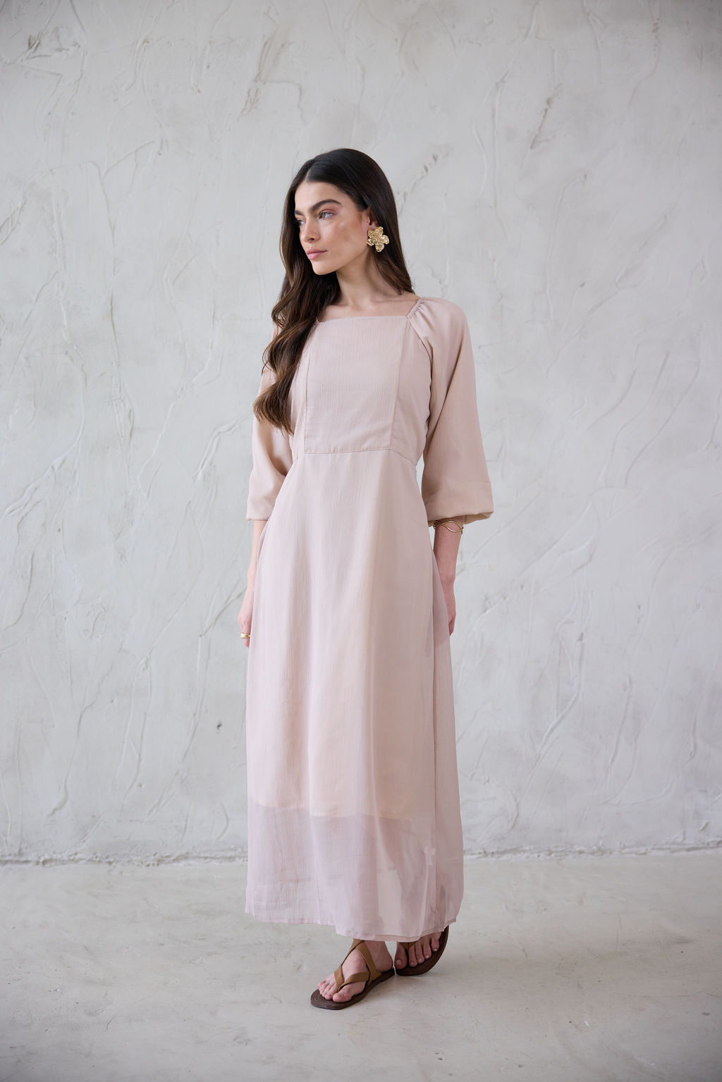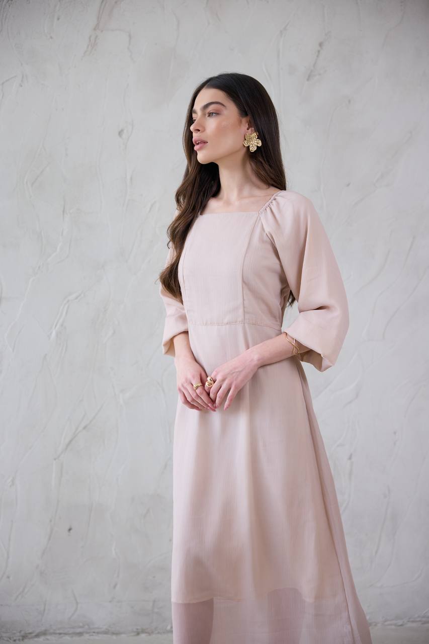 השרוול ה-3/4 עם סיומת גומי יוצר שילוב מושלם של נוחות וסגנון, ומאפשר לך תנועה חופשית ומרשימה. תחתית תפורה ומעוצבת מכסה את הברך, ונותנת לשמלה מראה שמזמין אותך לרקוד, להתנועע ולהנות מכל רגע.