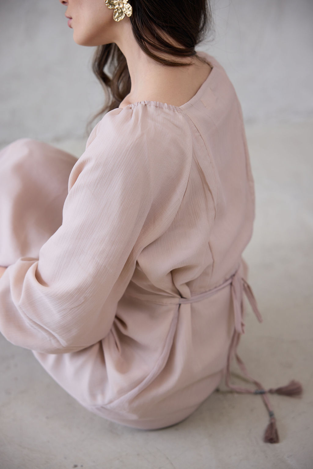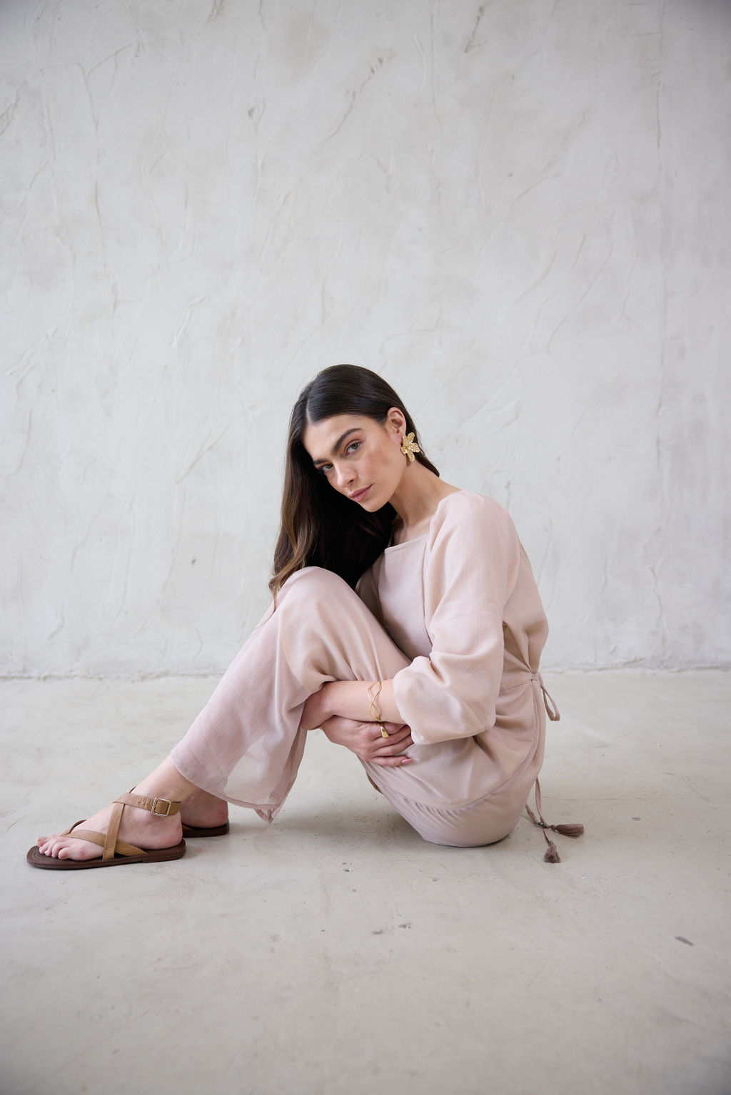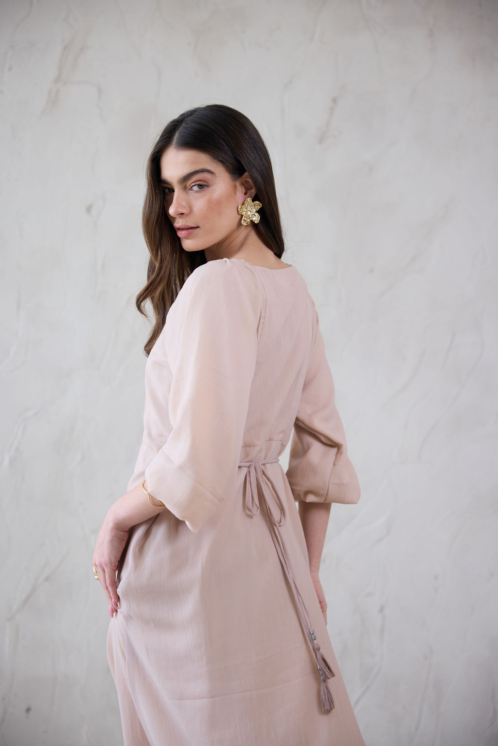 הדגם הזה ילווה אותך בכל רגע של החגיגה – מהמראה היומיומי ועד לאירועים מיוחדים. עשויה מבד שיפון קליל עם נגיעות מוזהבות עדינות השזורות בבד, שמוסיפות שיק וזוהר לכל צעד שלך.