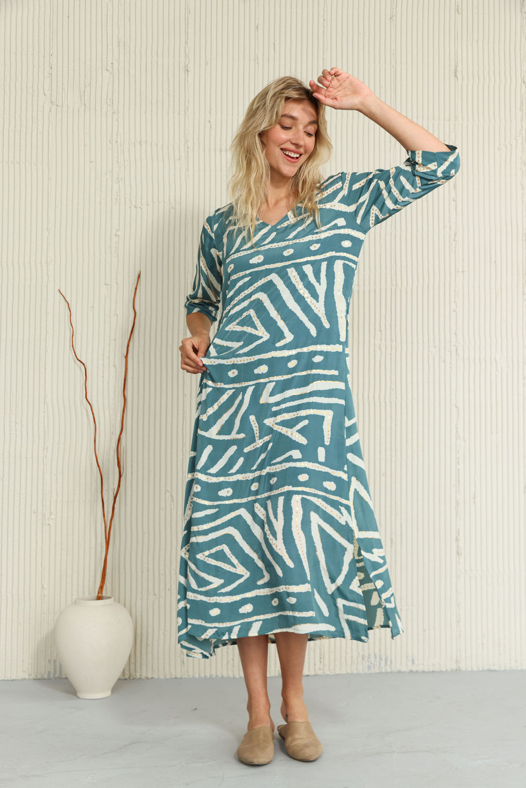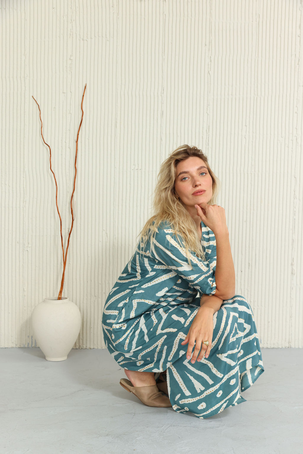 גוון תכלת של ים בשילוב פרינט גאומטרי שתמיד עובד עם נגיעות זהב