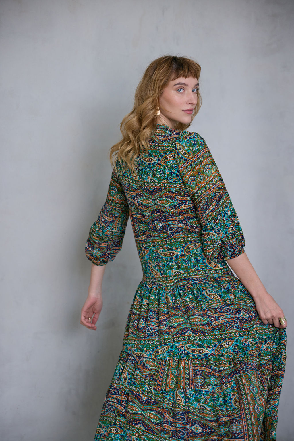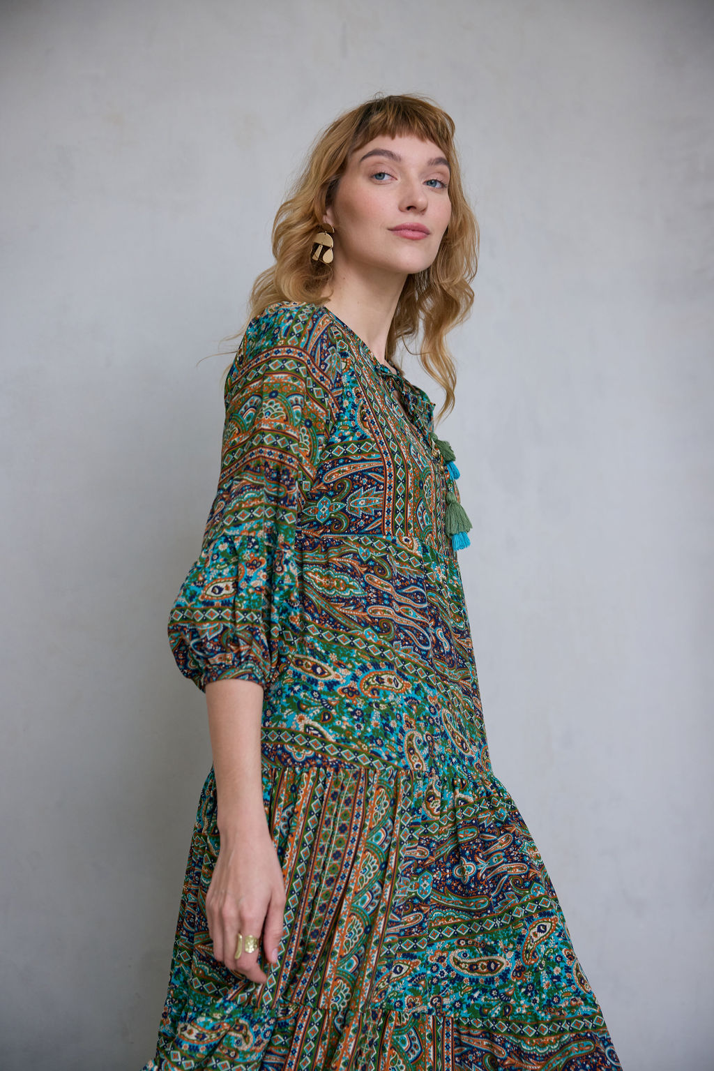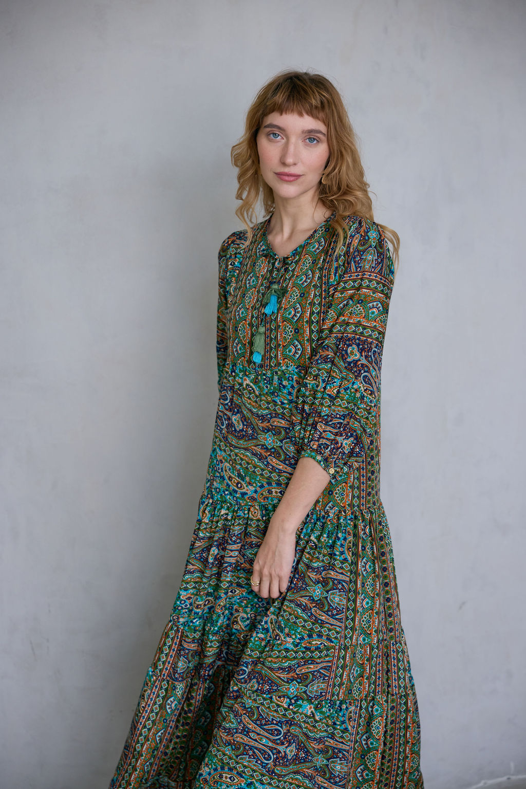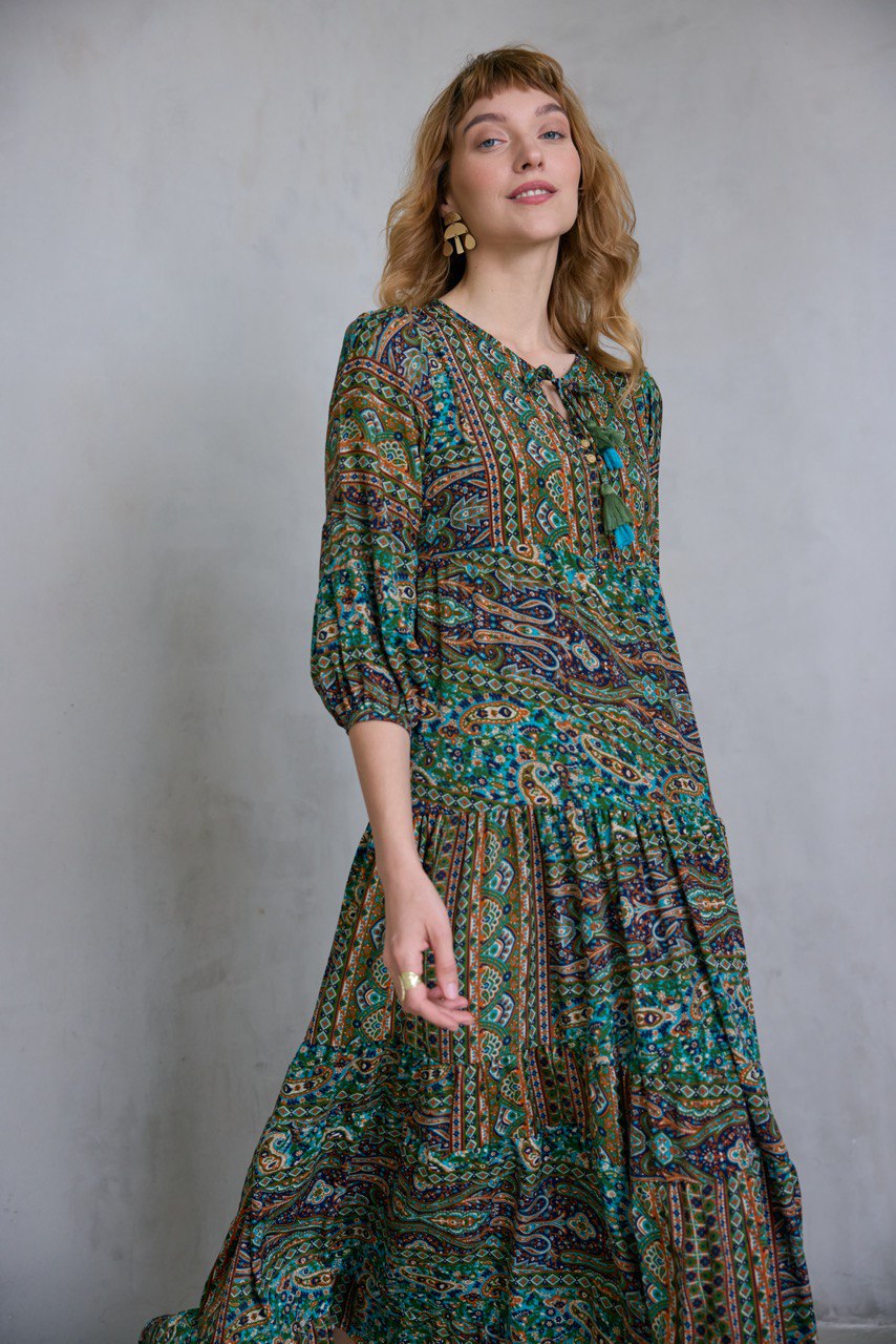 שמלת מקסי ארוכה עם בד מתנפנף בגזרה נשפכת ומחמיאה. קומות הבד יוצרות מראה עשיר ואלגנטי, ושרוולי התפוח עם סיומת הכפתור מוסיפים טאץ’ מחויט ומדויק. השמלה מעוטרת בשרוכים עם גדילים מיוחדים וחרוזים למראה ייחודי ושיק בלתי מתאמץ. מושלמת ליום ולערב