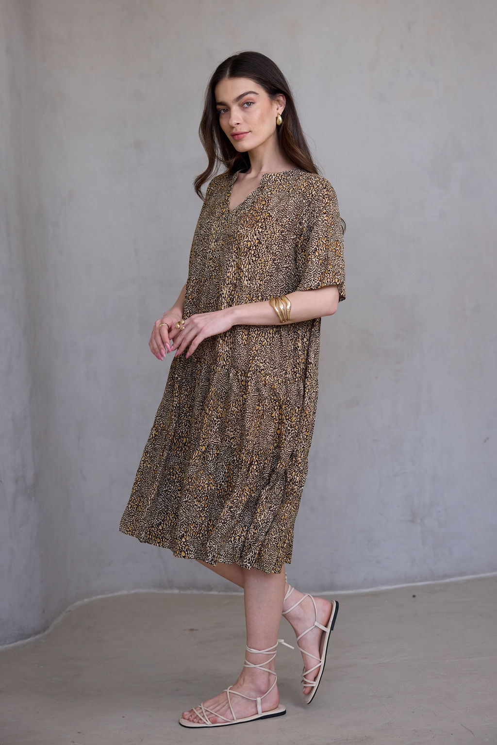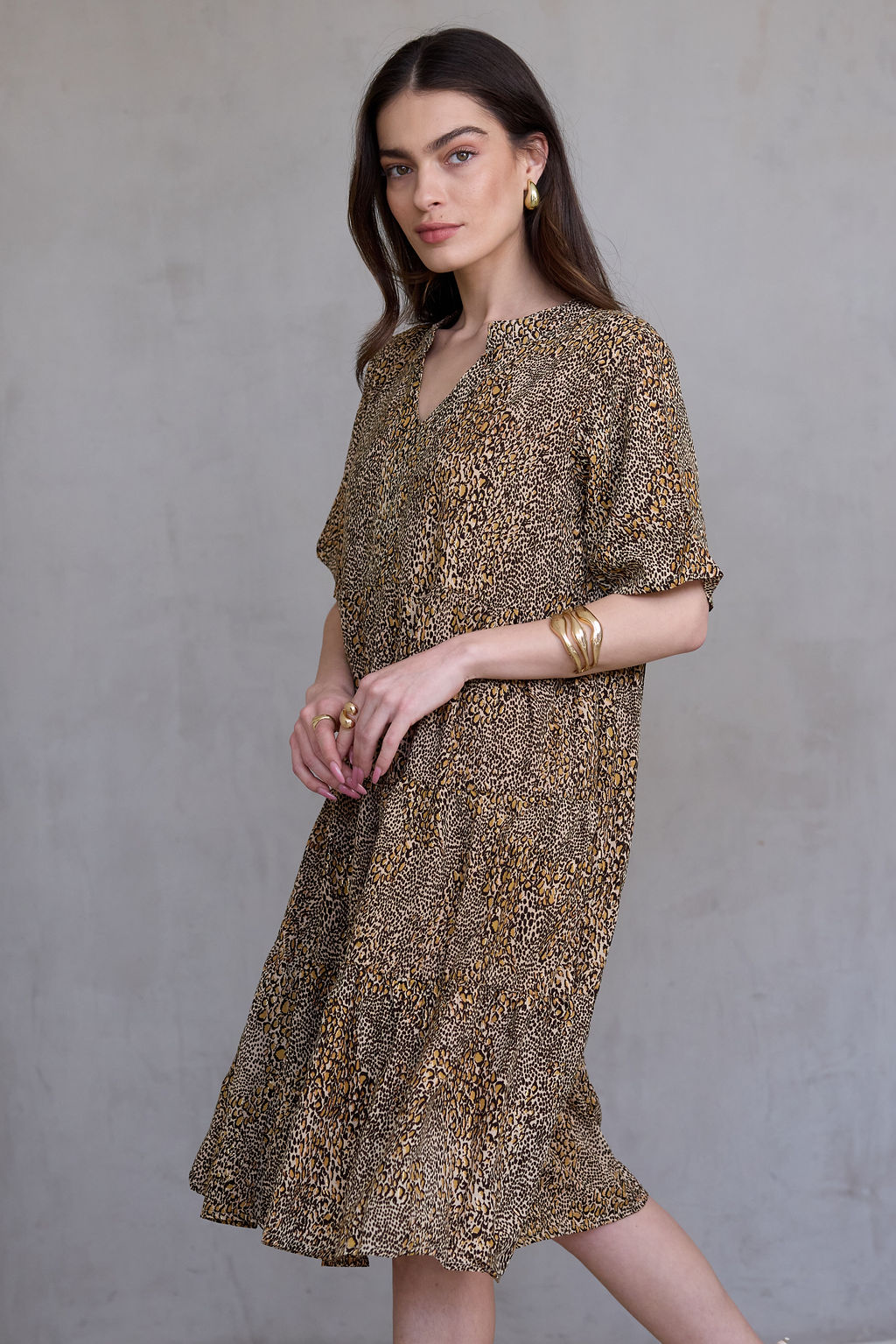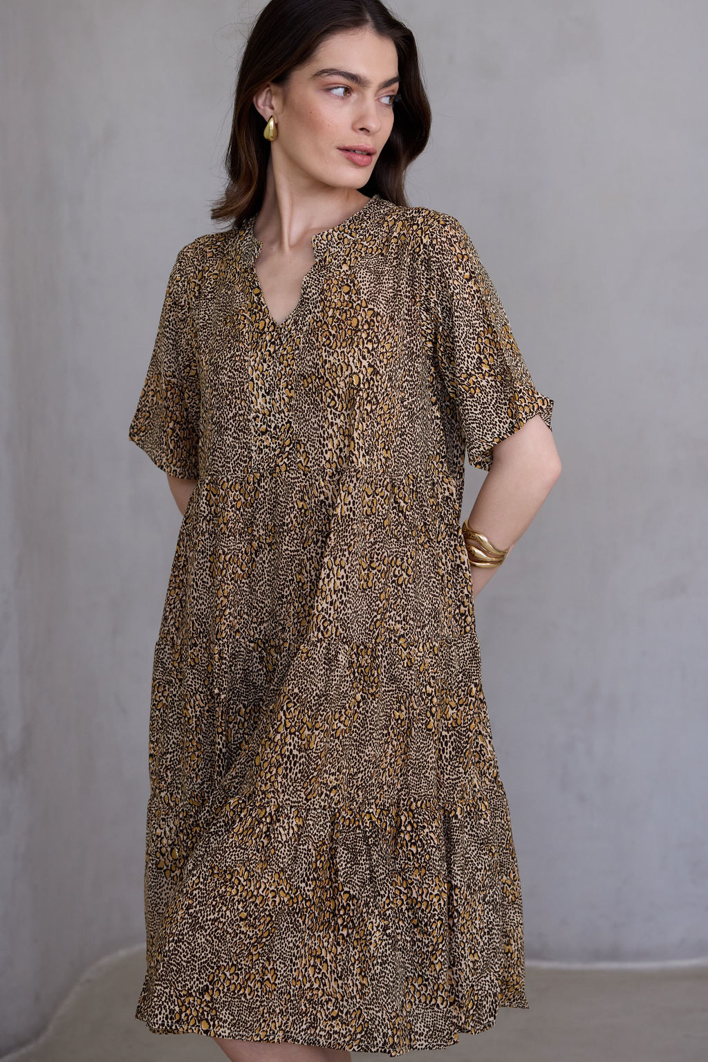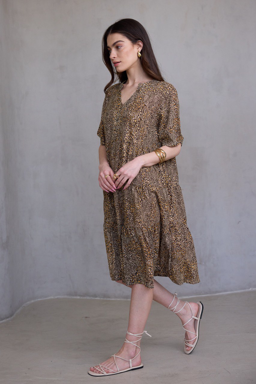 שמלת קומות קצרה באוברסייז, קלילה ומשוחררת, עשויה בד סאטן רך עם הברקת מוזהבת עדינה שמוסיפה זוהר עדין. השרוול הקצר והמשוחרר מעניק לשמלה תחושת נוחות וקלילות. המראה הכללי הוא זוהר אך לא מתאמץ, מושלם לאירועים קלילים או ליום-יום עם נגיעה של אלגנטיות.